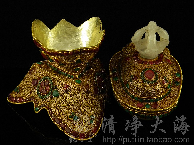 颅器为西藏密宗修法时,常见的法器之一,是以人类颅骨所制作的容器,共以人骨制,乃是取其无常之意,藏语称骷髅为“嘎巴拉”,其器身主要部分,由人颅骨造成,边再镶银或镶金。其上有盖,其下有座,座三角形,铸有三个骷髅,满缀代表火焰的花纹。