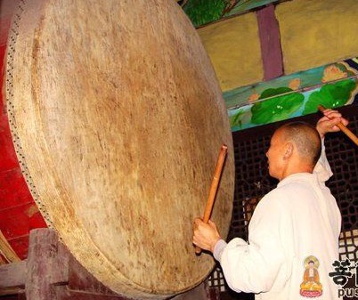 我国古代亦将在鼓用于仪式、舞乐与军阵中。唐代以降,禅林普遍使用大鼓。《敕修百丈清规》卷下,有“法鼓”、“茶鼓”、“斋鼓”、“更鼓”、“浴鼓”等多种。其中,法鼓是在住持上堂、小参、普说、入室时击之。上堂时击三通,小参时击一通,普说时击五下,入室时击三下,皆当缓击。茶鼓是在祖忌献茶汤时,长击一通,由侍司主之。斋鼓悬于库司之前,于斋时击三通。更鼓是由库司主之,早晚平击三通,其馀随更次击之。浴鼓是在浴时击四通,由知浴主之。